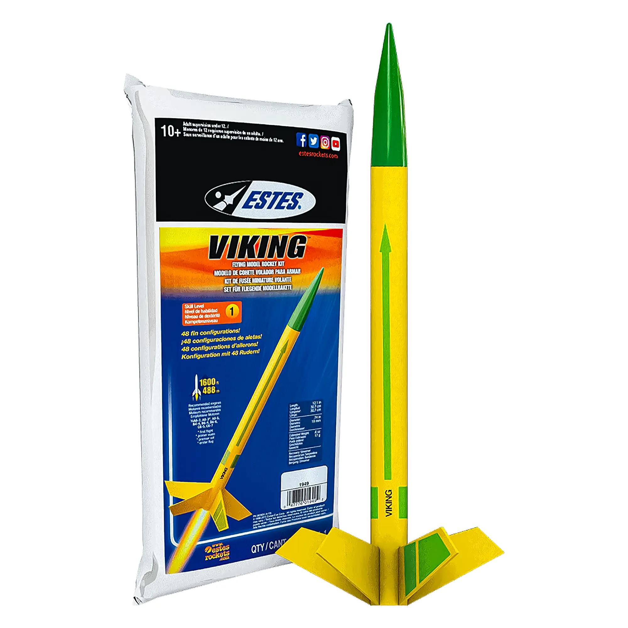 Viking-raketten er en fantastisk raket med 48 mulige finnekonfigurationer. Når den flyves på Estes standardmodelraketmotorer, kan Viking nå opsendelseshøjder på over 450 meter. Byg Viking på en dag og flyv til månen i morgen.