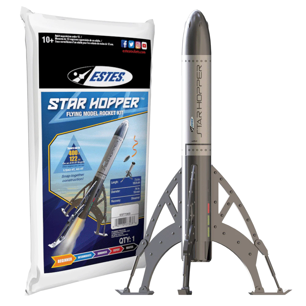 Obwohl es keine Beweise gibt, erweckt der Estes Star Hopper Rocket-Bausatz dieses geheimnisvolle Projekt mit seiner silbernen Lackierung im Retro-Stil der Atomzeit und den detailgetreu geformten Kunststoffflossen, der Nasenspitze und der Triebwerkshalterung zum Leben. Ein empfohlener Estes-Motor kann die Rakete bis zu 120 Meter hoch befördern und im höchsten Punkt einen 45 cm langen Strahler ausstoßen. Dieser Bausatz für Einsteiger ist einfach zu montieren und ideal für Flüge auf kleinen Feldern und Vorführungen. Mit der Estes Star Hopper Rocket können Sie Ihre eigene Version dieses mysteriösen Fluggeräts fliegen!